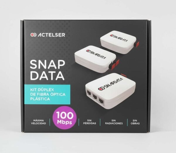 El Kit Dúplex de snap Data instala fácilmente internet de Fibra Óptica Plástica en 2 puntos adicionales 100 megas aprovechando el 100% del ancho de banda contratado. Este Kit es una versión ampliada y más completa de nuestro Kit básico, ideal para viviendas un poco más grandes, de tres plantas o que tienen una estancia separada del resto.